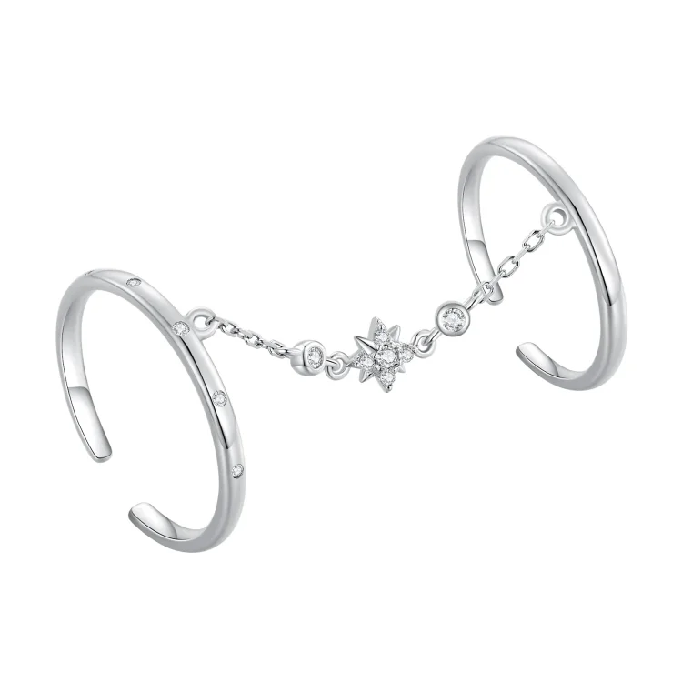 Pandora Style Chain Double Ring Open Ring - BSR405, popoln dodatek za predstavitev vašega edinstvenega stila. Ta eleganten kos je okrašen z nežnimi zvezdastimi poudarki, ki vaši obleki dodajo pridih muhastosti. Lahka verižica v obliki črke 0 brezhibno povezuje dva obroča in ustvarja moderen in prefinjen videz. Ta dvojni prstan, izdelan z izjemno pozornostjo do detajlov, mora imeti tisti, ki cenijo vrhunsko izdelavo. Izrazite svojo individualnost in izboljšajte svojo modno igro s tem osupljivim odprtim prstanom z dvojnim obročem Pandora Style Chain - BSR405.
