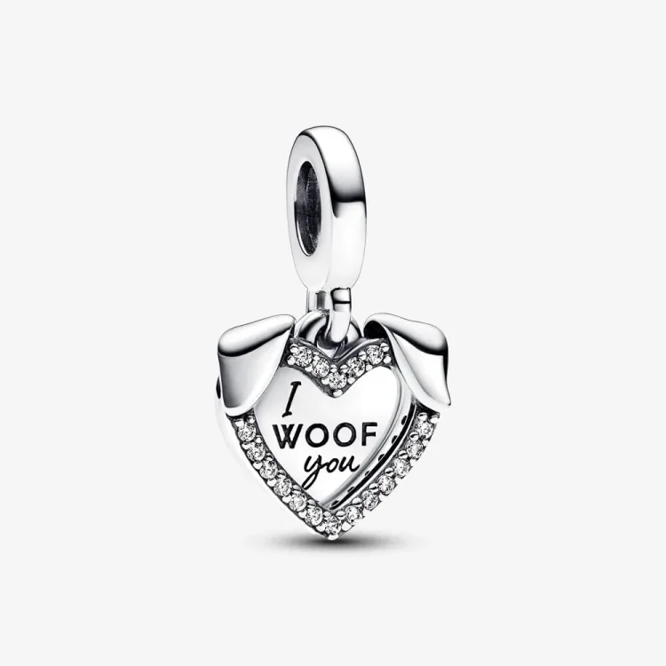 Ta je za vse pasje mame! Nosite simbol svoje ljubezni do svojega krznenega otroka z dvojnim visečim obeskom Heart & Dog. Ta ljubek dvojni viseči obesek iz srebra čistosti sterling ima izrezano srce z vrsto bleščečega pavéja, ki sledi obliki srca, in dvema visečima pasjim ušesom na vrhu. Disk v obliki srca za njim je vgraviran s sporočilom "I WOOF you." Podarite ga pasjemu staršu v svojem življenju ali ga nosite na nakitu ali držalu za obeske kot spomin na vašega zvestega štirinožnega prijatelja.