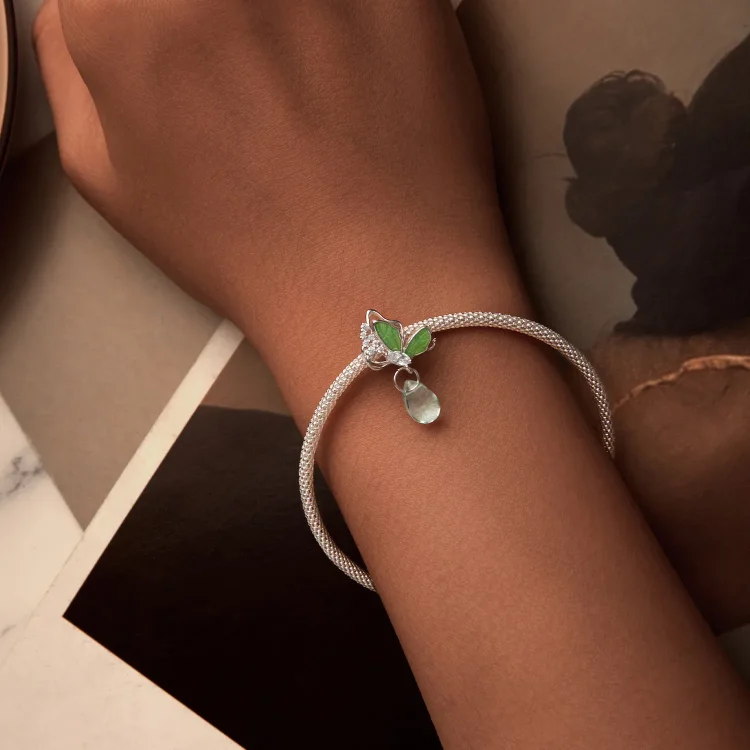 Predstavljamo očarljive kroglice PANDORA Style Oasis Butterfly Beads! Te čudovite perle so opremljene z nežnimi zelenimi obeski metuljev z lesketajočimi krili, združenimi s prosojnimi zelenimi steklenimi kapljicami. Te kroglice simbolizirajo dušo, ki je hkrati lepa in svobodna, predstavljajo tudi rast in preobrazbo. Dodajte svoji zbirki nakita pridih elegance in pomena s temi edinstvenimi in pomenljivimi kroglicami.