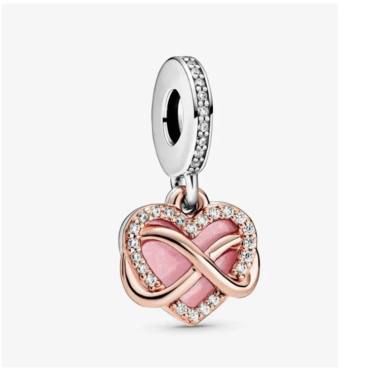 Popeljite svojo ljubezen v neskončnost in še dlje s tem lesketajočim dvostranskim visečim obeskom. Sprednja stran visečega obeska je ročno dokončana v zlitini Pandora Rose, naši edinstveni mešanici kovin s 14-karatno rožnato pozlato in simbol neskončnosti, ki se obija okoli svetlikajočega se srca, obrobljenega s prozornimi kubičnimi cirkoni. Hrbtna stran visečega obeska je emajlirana z ročno nanesenim emajlom, ki deluje kot prava kulisa za pisanje pomembnih sporočil iz srca. Na hrbtni strani obeska je napis »Family forever and always« (Družina za vedno in večno).