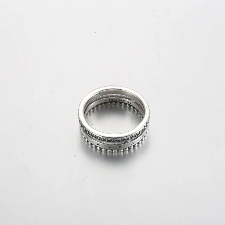 Prefinjen dodatek za vsako opravo. Prstan Pandora Signature z logotipom ter perlicami in pavé iz srebra sterling odlikuje večkratno teksturiran videz s kontrastnimi obodi s perlicami in pavé. Logotip Pandora je vrezan na poliranem srednjem obodu. Nosi ga lahko tako, da stran s perlicami gleda navzgor ali pa nasprotno, glede na izbrani videz.