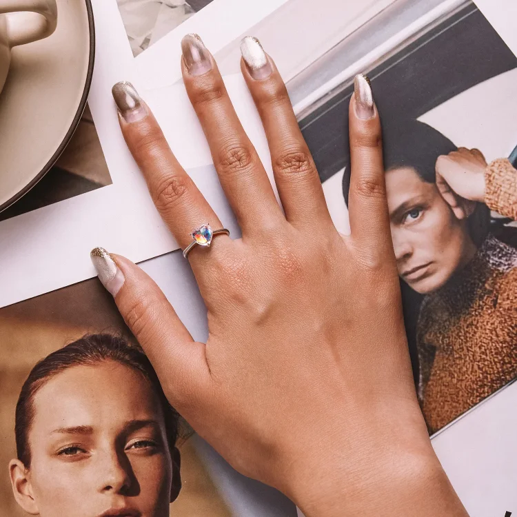Ta prstan je res čudovit! Iskrivčeno srce v sredini odlično lovi svetlobo in ustvarja čudovit mavrični učinek. Zasnova je nežna, a opazna, kar ga naredi vsestranskega za vsakodnevno nošenje in posebne priložnosti. Izdelava je brezhibna, prstan pa je trpežen in dobro narejen. Všeč mi je, kako doda vsakemu outfitu kanček eleganca in igrivosti. Vsekakor je izstopajoč kos v moji zbirki nakita!
