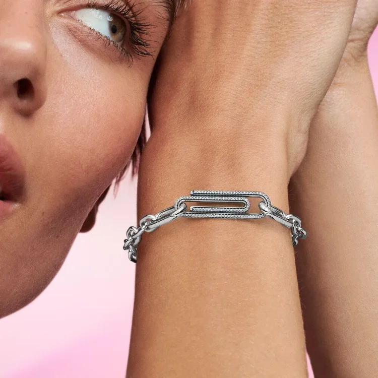 Popestrite vaš videz Pandora ME s kančkom pop punka s tem najnovejšim slogovnim členom v obliki sponke za papir. Ta realistični motiv bo preobrazil vaše členaste verige z imenitnim sodobnim pridihom. Sponko za papir iz srebra sterling na eni strani krasi sto mikroperlic iz okroglih prozornih kubičnih cirkonov za edinstven lesk, poln samoizražanja. Dolžina stilističnega člena s sponko za papir se idealno ujema z dolžino kateregakoli stilističnega dvojnega člena ali štirih majhnih prepletajočih se členov. Stilirajte ga med stilskimi spojniki, ki jih je moč odpreti, na členastih zapestnicah ali ogrlicah Pandora ME ali pa ga obesite na obročaste uhane za edinstven izraz.